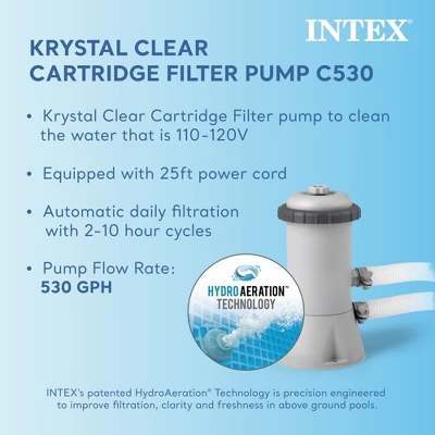 Beat the heat and make a splash in this INTEX 12 x 2.5 Foot Metal Frame Above Ground Pool and Filter. Keep your pool water nice and clean with an included pool and maintenance kit.At 12 feet wide and 30 inches in height, this metal frame pool is great for having friends and family over to cool off. It’s made of strong and durable high-molecular Super-Tough PVC, which is highly resistant to abrasions, impact, and sunlight. The pool set includes an INTEX 530-gallon-per-hour filter pump, 1 Type “A” filter cartridge, and a helpful instructional DVD to get you started. The above-ground pool cover helps keep your pool free of dirt, insects, and debris when not in use. This cover features drain holes to prevent water from accumulating on top. It comes with nylon rope ties and a 10-inch overhang to keep your above-ground pool covered and free from debris.The maintenance kit includes a pool vacuum, skimmer, and pole. Attach the vacuum to the 94-inch telescoping pole. Simply connect your garden hose and suck debris into the reusable debris bag. Then attach the surface skimmer to the pole and collect leaves and other floating particles.Note: Requires flat, level ground for proper installation.Disclaimer: Please review your HOA rules and restrictions before purchasing this product. Not all housing agencies permit private above-ground pools.