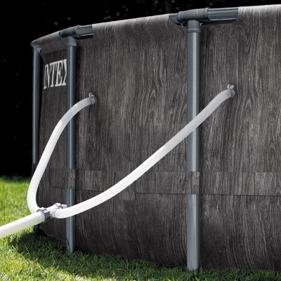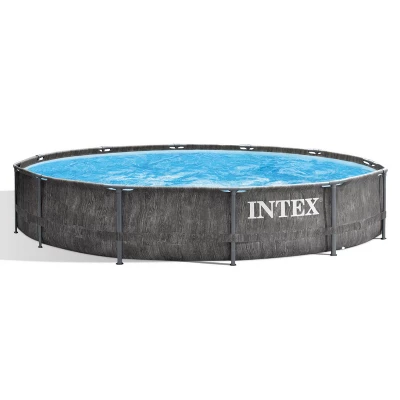The Intex 12-Foot by 30-Inch Greywood Prism Steel Frame Pool Set has everything you need to get the backyard pool parties going this summer. Featuring a sleek wood grain texture exterior, this round swimming pool adds a touch of modern flair to your backyard. Prism frame pools are enhanced with strong, powder-coated steel tubing which is durable and easy to assemble. Included T-joints allow for quick set-up without the need for pins or tools. The pool liner is stylish and constructed with puncture-resistant, 3-ply material so you can enjoy your 12-foot swimming pool for years to come. The included canopy offers UPF 50+ sun protection so you’ll have optimal shade throughout. Choose which side of the pool you want the canopy to cover, and that way you can have the other side free to get a little sun if you so desire.This above-ground swimming pool includes a Krystal Clear cartridge filter pump that operates at 530 gallons per hour and HydroAeration technology to keep your water clear and sparkling. Start your summer off with a complete above ground pool set with the Intex 26749ST Greywood Prism Steel Frame Swimming Pool Set.
