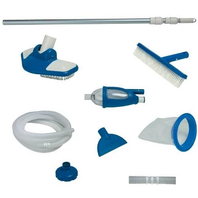 The Intex 2800 GPH Above Ground Pool Sand Filter Pump with Automatic Timer provides cool, refreshing, clear water, and less hassle every swim season.If you are tired of buying and replacing pool filter cartridges, this filter is the one for you. With virtually no maintenance, your sand pump only needs replacement every five years.This sand pump features a powerful motor, 6-function control, and a built-in automatic timer. It meets the UL standards and is an excellent upgrade to the filter cartridge system on your Intex Above Ground Swimming Pool (Easy Set, Metal Frame and Ultra Frame — up to 17,200 gallons).This package also included the Intex Deluxe Maintenance Kit with includes several great tools to keep your pool water looking crystal clear. The included vacuum sucks debris from the pool floor by utilizing your filter pump. The deluxe skimmer collects floating debris while the leaf rake is great for skimming anything that is missed. Easily brush grime from pool walls with the wall brush and telescoping pole. A clean pool is a safe pool! Maintenance is a part of every swimming pool and with this Intex Pool Sand Filter Pump and Deluxe Maintenance Kit you’ll have the right tools for the job, cutting down on your time spent cleaning.