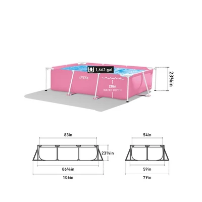Think Pink! The Intex Pink Rectangular Frame Pool is the perfect addition for summer. Easy to assemble, this pool is ready for water in just 30 minutes so you can escape the heat quickly. It’s supported by strong, durable steel frames and durable sidewalls so the pool stays firmly in place. The frames are also powder-coated for rust resistance and beauty. The pool features dual-suction outlet fittings that improve water circulation (pump not included).This backyard swimming pool is a refreshing and relaxing backyard retreat for up to 6 people. Featuring a convenient drain plug that connects to any hose so that water can be drained away from your house and pool area for ideal convenience. Your family will enjoy swimming, splashing, and playing all summer long in this exciting swimming pool. Relax, make a splash, and escape into your pink summer oasis in the Intex Rectangular Frame Swimming Pool on any hot summer day.Disclaimer: Please review your HOA rules and restrictions before purchasing this product. Not all housing agencies permit private above-ground pools.