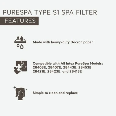 Keep your spa water clean and Intex PureSpa performing at its best by using genuine Intex PureSpa Type S1 Pool Filter Cartridges.This is the authentic replacement cartridge for your Intex PureSpa. It works with all Intex PureSpas models including 28403E, 28407E, 28443E, 28453E, 28421E, 28423E, 28413E, and 28453E. Replace your filter cartridges regularly for the best results. It is recommended that you replace cartridges every 2 weeks to maximize your spa performance.Help ensure the longevity of your Intex PureSpa by regularly choosing Intex PureSpa Type S1 Pool Filter Cartridges.