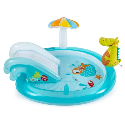 Let your little ones swim and splash all summer long with the Intex Gator Inflatable Kiddie Pool Water Play Center. This backyard kiddie pool has everything a kid needs to have fun in the sun.Your kids will love splashing the afternoon away with Gator and his friends. This inflatable kiddie pool features a slide, sprinkler, water bucket, mushroom shade, and duck floatie. Just attach your garden hose to Mr. Gator to create the spraying sprinkler. They’ll land safely in the shallow pool every time thanks to the cushioned landing mat under the slide.This kiddie pool and slide measures 79 inches long, 67 inches wide, and 33 inches tall. Made to last summer after summer, this outdoor water play center is constructed of durable PVC. The toddler kiddie pool can hold up to 42 gallons of water and supports 120 pounds.Recommended for kids ages 2 years and older.