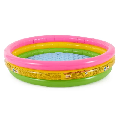 Your little swimmers will want to splash and play until the sun goes down in this Intex Inflatable Sunset Glow Kiddie Pool with Multi-Colored Fun Ballz.With fun, vibrant rainbow colors and a soft inflatable floor, there’s no way your kiddos won’t have a blast swimming in this pool. This is the perfect backyard pool for cooling off on hot summer days. Constructed of durable vinyl, this kids’ pool is built for long-term use. Since young ones can be unpredictable, this baby pool includes a repair patch. The overall size of the pool measures approximately 4.5 feet in diameter and 1 foot tall, allowing for 9.5 inches of water. This pool features a cushioned, inflatable floor that keeps your little backyard swimming bums comfortable and safe.These 2.5-inch air-filled balls come in 6 bright colors, including red, yellow, blue, orange, green, and purple. Made of durable but soft plastic materials, these balls will not puncture when a child jumps on the pile or throws them. Including a convenient carrying bag, you can easily store and transport these multipurpose balls.Let the fun and creativity begin with the Intex Inflatable Jungle Adventure Play Center & Plastic Fun Ballz.