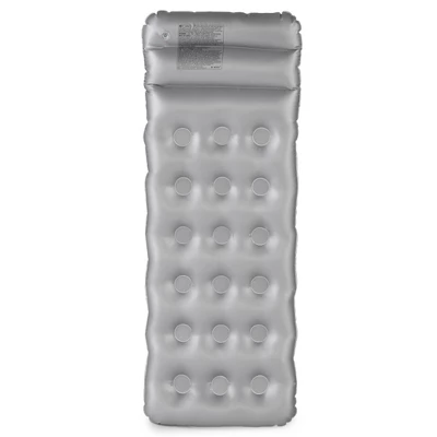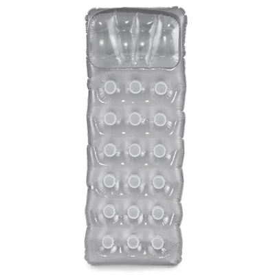Soak up the rays while relaxing on the Intex Suntanner Lounge. This inflatable pool float features a comfortable built in pillow for extra comfort. The 18 pockets even double as cup holders!This float is in the style of French coil beam style air mattress, a classic pool staple. The mattress shape is supportive and comfortable, and its 11-gauge vinyl top and 12-gauge bottom makes it extra durable. Nicknamed the Suntanner, this float is an open pool lounger and allows for the most sun to hit your skin so you can get an even tan. The transparent top won’t get hot to the touch, so sunbathe in comfort.This floating lounge is the right choice for a warm day out on the water.