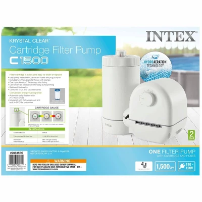 Keep your pool water Krystal Clear and refreshing this summer with the Intex C1500 Cartridge Filter Pump with GFCI for Above Ground Swimming Pools (110-120 Volt)! Boasting a pump flow rate of 1,500 gallons per hour and a system flow rate of 1,180 gallons per hour, this pump will circulate and filter the water in your above ground pool to keep everything clean, refreshing, and fun. Easy pump installation – just attach hoses and plug in. Includes two 1 1/2-inch diameter hoses with clamps. One HydroAeration Technology inlet fitting. Convenient air release valve for easy pump priming, Sediment flush valve. Convenient energy-saving timer. Automatic daily filtration with 2+-12 hour cycle. Equipped with 25ft power cord and built-in GFCI for protection. Cartridge Gauge – Easily find out if it is timer to clean or change the cartridge. Features: Turnover Rate/System Flow: 1180 GPH. Pool Size/Water Capacity: Minimum: 700 gallons. Maximum: 9400 gallons. Easy Set Pool; 14ft, 15ft Frame Pool; 16ft x 8ft Prism Frame Rectangular Pool.