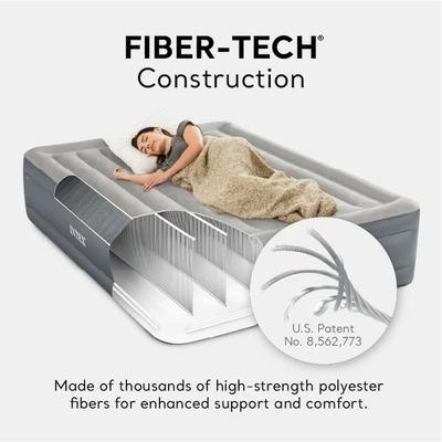 Enjoy a good night’s rest and a quick set-up on all of your camping trips with the Intex Blow Up Mattress Air Bed.Perfect to take camping or to use as an extra bed for house guests, this inflatable air mattress features Fiber-Tech interior construction for firmness and support. The velvety mattress top allows for comfortability and softness, making anywhere the perfect spot for sleep and relaxation. Raised 18 inches for your convenience, this air bed also has indented sides to help grip fitted sheets and an outer perimeter frame to provide additional stability and support. This inflatable mattress comes with built-in a powerful internal pump for rapid inflation and deflation. With an approximate inflating time of 4 minutes, you can begin to use the air bed right away.For a great rest, convenience, and a no-hassle set-up add Intex Blow Up Mattress Air Bed to your next camping trip or guest room.