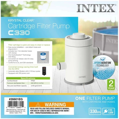 Keep your pool water Krystal Clear and refreshing this summer with the Intex Krystal Clear Cartridge C330 Cartridge Filter Pump with GFCI (110-120 VOLT). Boasting a pump flow rate of 330 gallons per hour and a system flow rate of 300 gallons per hour, this pump will circulate and filter the water in your above ground pool to keep everything clean, refreshing, and fun. In addition, the maintenance for this pump is a breeze: just the occasional cartridge rinse or swap to keep this pump running strong. This filter uses Type H filter cartridges (Item #29007E) which should be changed every couple of weeks. For Intex 6ft, 8ft, 10ft Easy Set Pools and 10ft Round Frame Pools. Water flow rate at pump: 330gph, System flow rate: 300gph. Easy installation – Just attach hoses and plug plump in! Includes two 1 1/4-inch diameter hoses with clamps. One HydroAeration Technology inlet fitting. Convenient air release valve for easy pump priming.