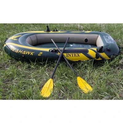 If you love spending time on the water, the Intex Seahawk 2 Inflatable Boat Set is the best company on the lake or river. This boat seat comes with 2 French oars and a high-output hand pump to make inflating your Seahawk 2 fast and easy so you can hit the water. Motor mount fittings are included when you want to add a motor and glide down the water effortlessly. There’s a grab handle on the bow, an all-around grab line, welded oar locks, and oar holders for your convenience.If you want to fish and relax on your boat, there are 2 built-in fishing rod holders and a gear pouch for you. The Seahawk will never let you down with its heavy-duty PVC vinyl construction that can hold up to 520 pounds.We hear the water calling your name, so get out there with a paddling pal on the Intex Seahawk 2.