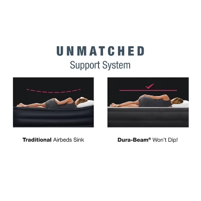 Impress your most important guests with the INTEX® 20in Queen Pillow Top Airbed. This bed features patented Fiber-Tech interior construction for superb durability and support. The velvety soft comfort top surface contours the body for a great night’s sleep. The horizontally positioned beams combined with unique edge construction provide superior stability. The powerful internal pump easily inflates and deflates the bed.